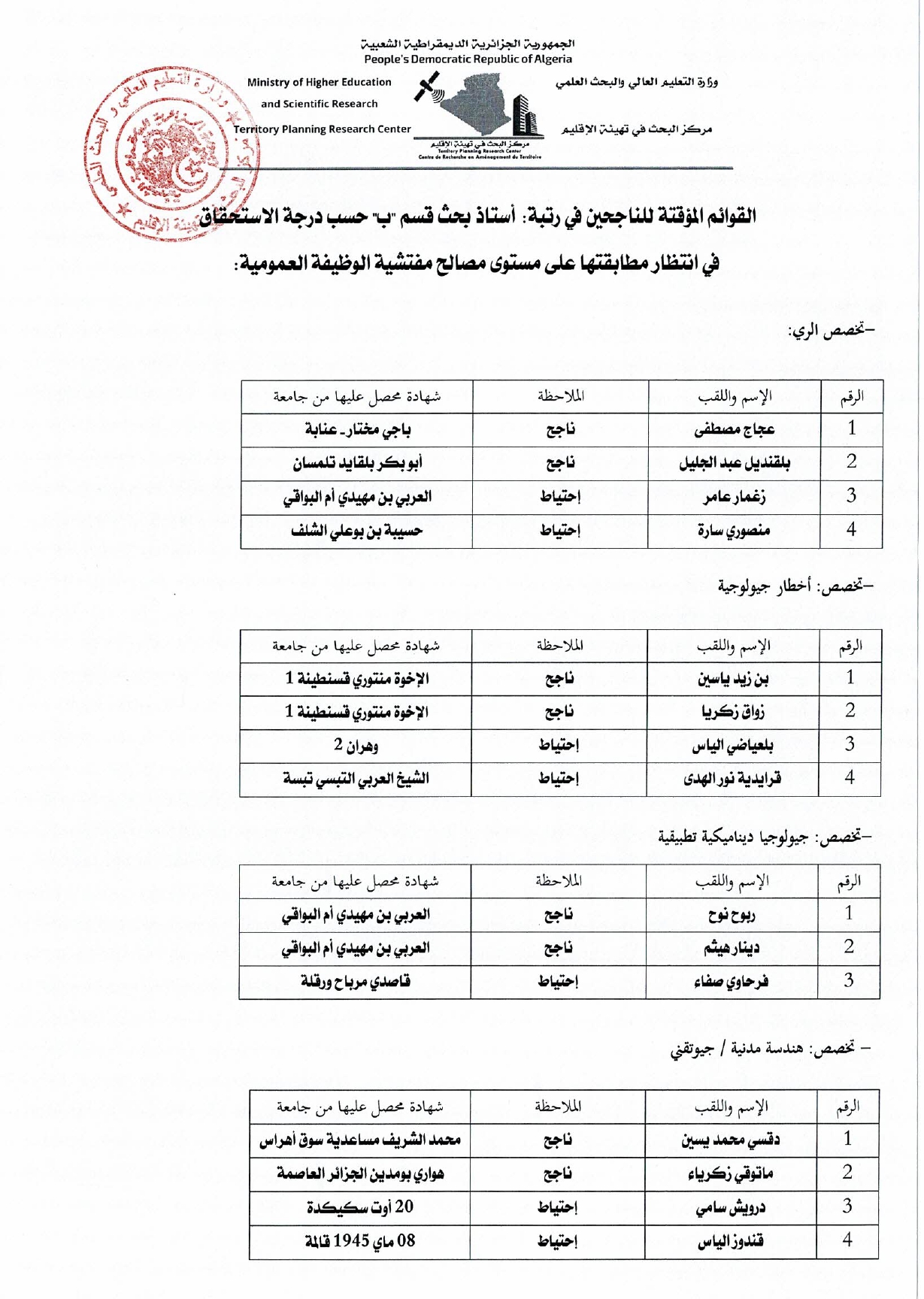 Célébration du mois du patrimoine18 avril 2024Fête du Travail 20242 mai 2024 24 avril 2024 Categories Announcements Recrutement Mots clés Liste provisoire des résultats de recrutement Le Centre de Recherche en Aménagement du Territoire (CRAT) annonce la « Liste provisoire des résultats du recrutement externe sur titre pour l’année budgétaire 2023 » pour le grade de « Maître de Recherche Classe B ». Partager63 Articles Similaires4 février 2026Programme Science by WomenPour en savoir plus4 février 2026Projet international « nZEB-Mzab » : le CRAT retenu au programme i-COOP 2025Pour en savoir plus2 février 2026Avis d’attribution provisoire de la consultation n° 02Pour en savoir plus