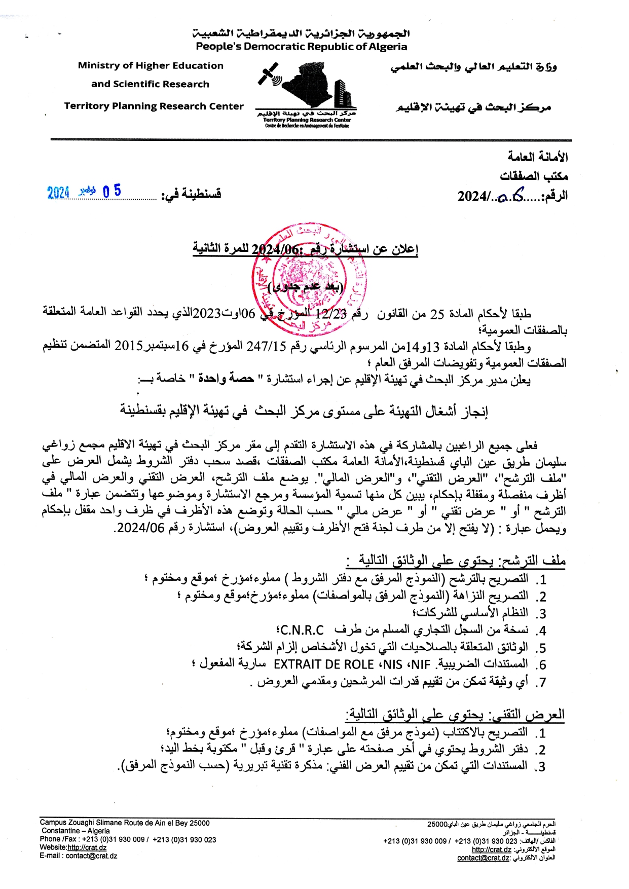 اعلان استشارة رقم 075 نوفمبر 2024الذكرى السبعون لعيد الثورة التحريرية المجيدة6 نوفمبر 2024 6 نوفمبر 2024 الأصناف الاستشارات كلمات استدلالية يعلن مدير مركز البحث في تهيئة الإقليم عن اجراء استشارة “حصة واحدة” خاصة بــ : إنجاز أشغال التهيئة على مستوى مركز البحث في تهيئة الإقليم بقسنطينة Partager34 مقالات مشابهة5 فبراير 2026إعلان عن عدم جدوى الاستشارة رقم 2026/01لمعرفة المزيد2 فبراير 2026إعلان إستشارة 03 / 2026لمعرفة المزيد11 يناير 2026إعلان إستشارة 02 / 2026لمعرفة المزيد