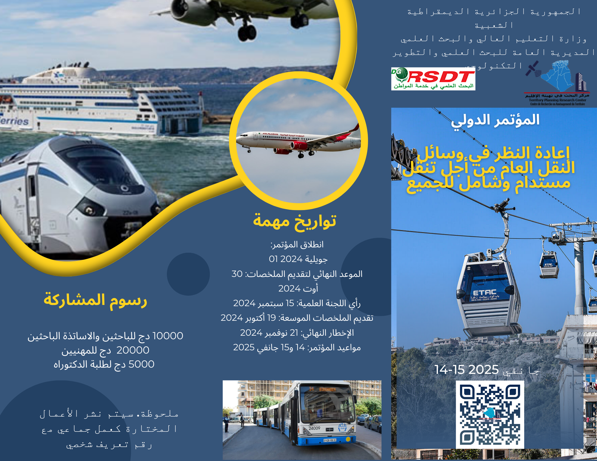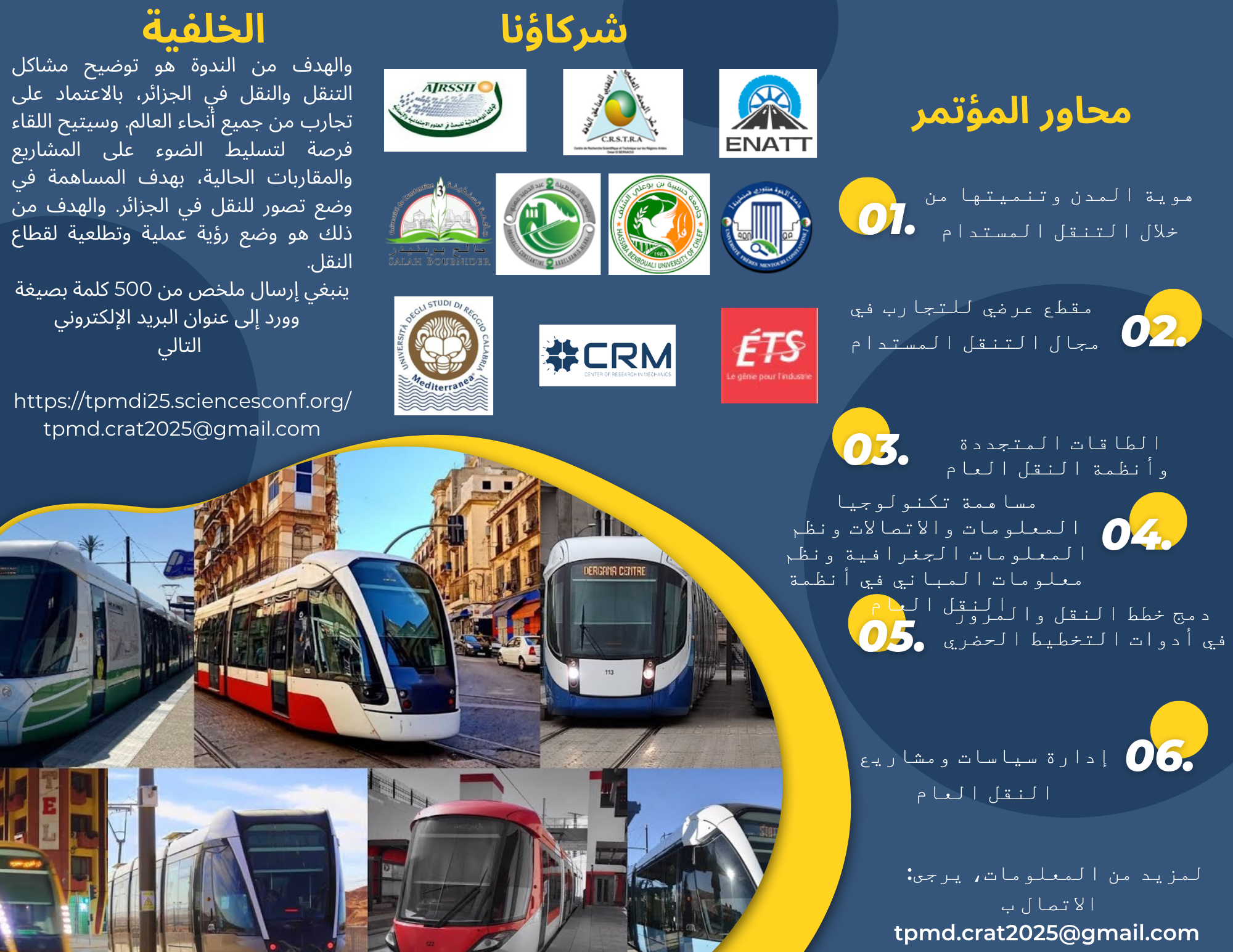 7 يوليو 2024ينظم مركز البحث في الإقليم (CRAT)، بالشراكة مع ATRSSH، CRM، CRSTRA، ENATT، UC3، UC1، UC2، جامعة الدراسات المتوسطية في ريدجو كالابريا (إيطاليا)، ومدرسة التكنولوجيا العليا (ÉTS) في مونتريال (كندا)، مؤتمرًا دوليًا بعنوان: “إعادة التفكير في النقل العام لتحقيق تنقل مستدام وشامل” في 14 و 15 جانفي 2025.
