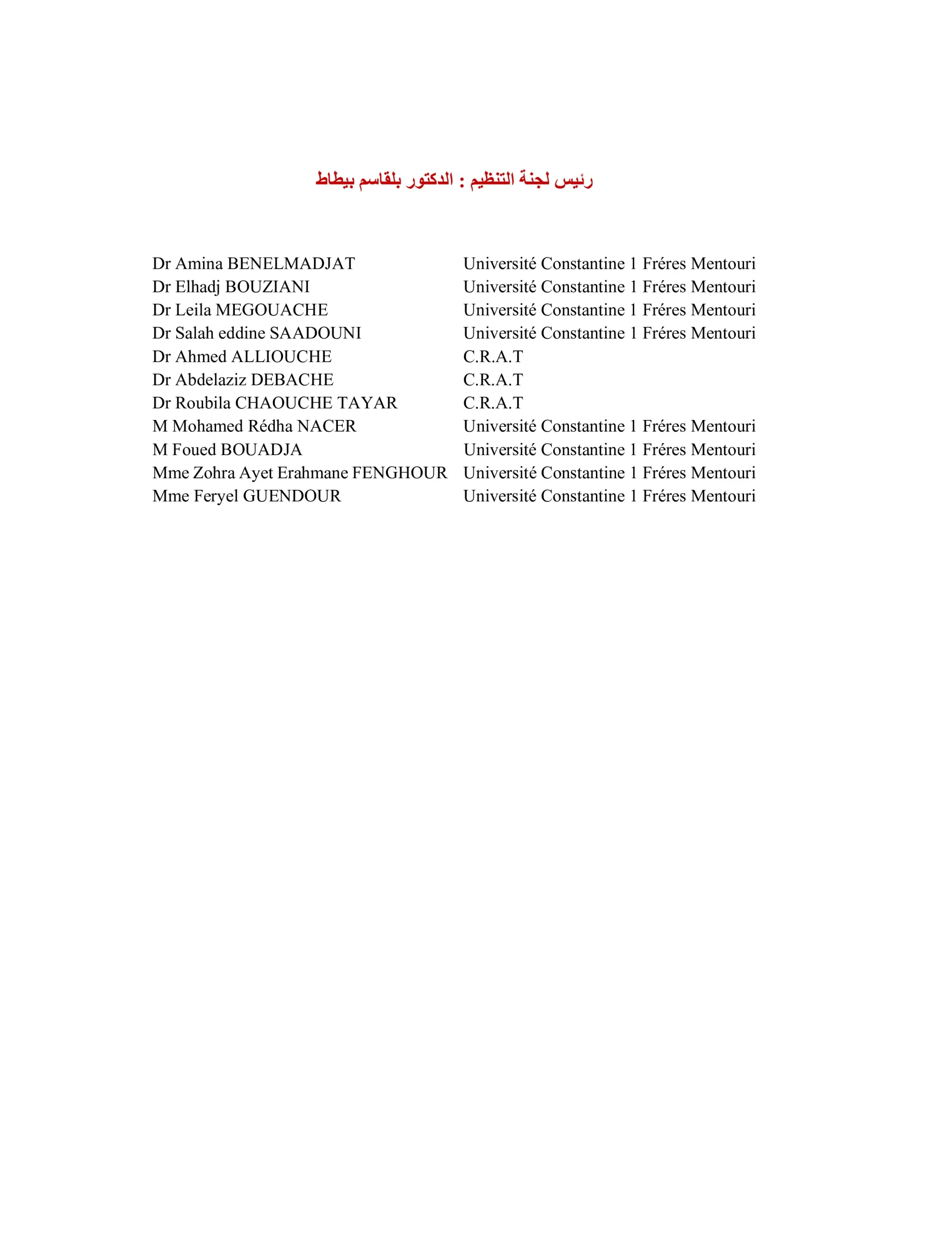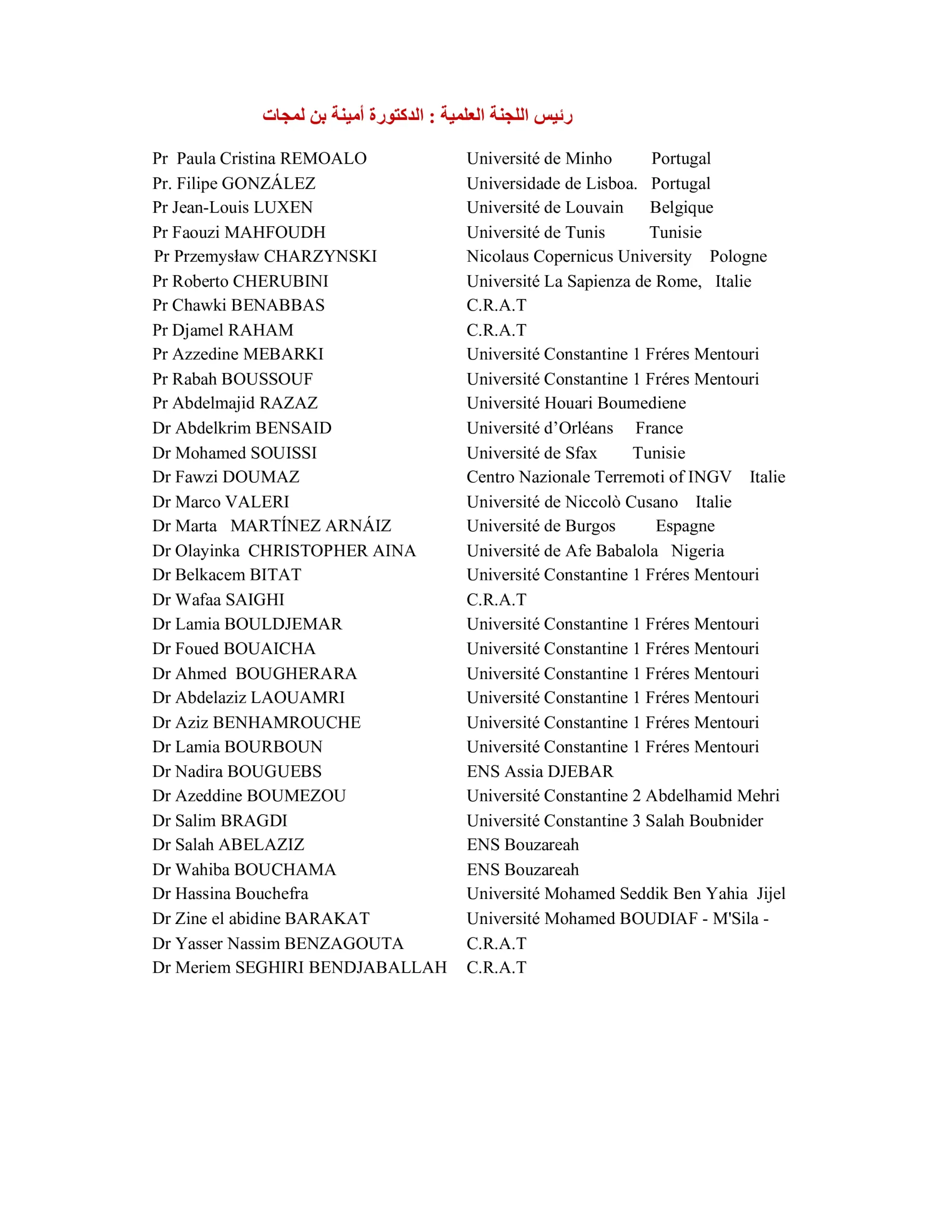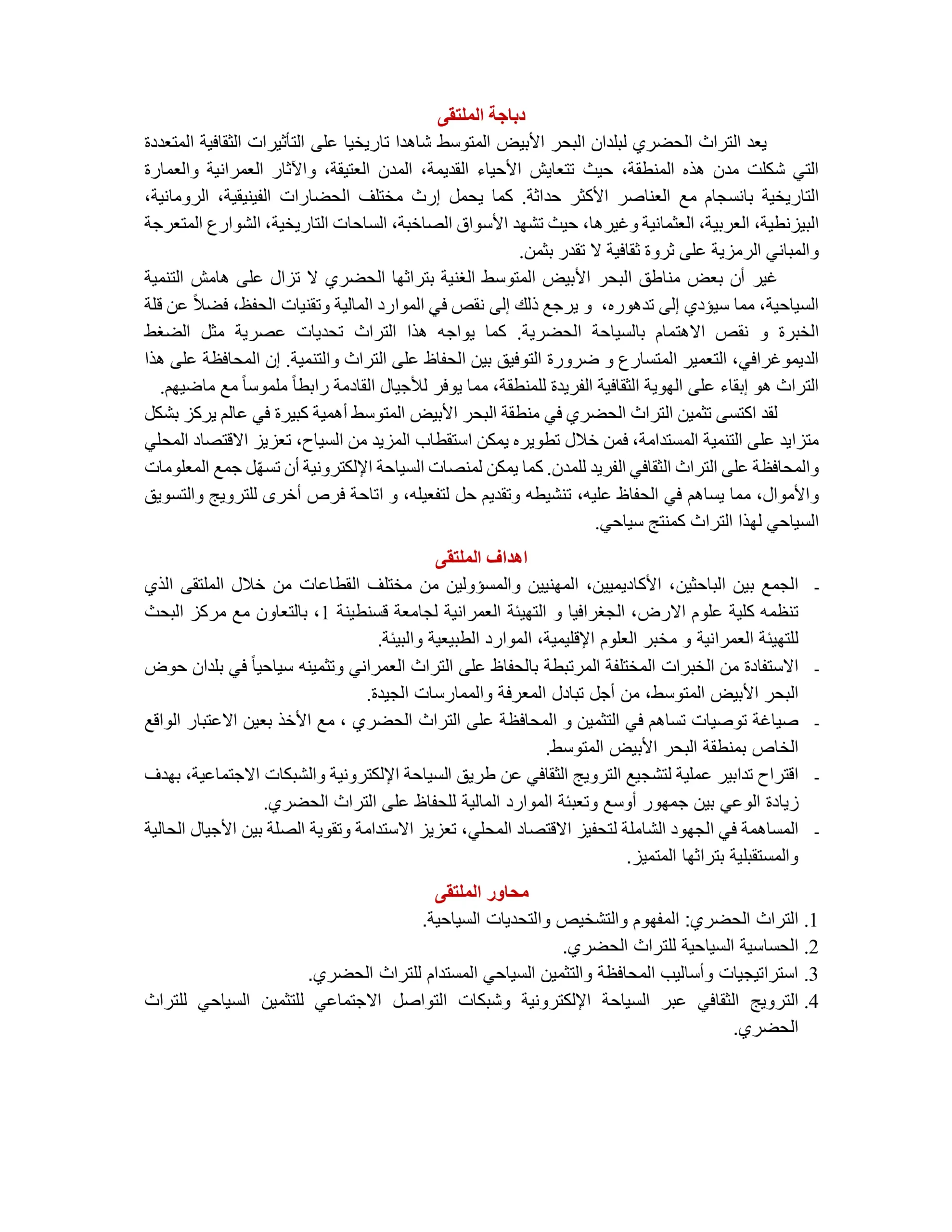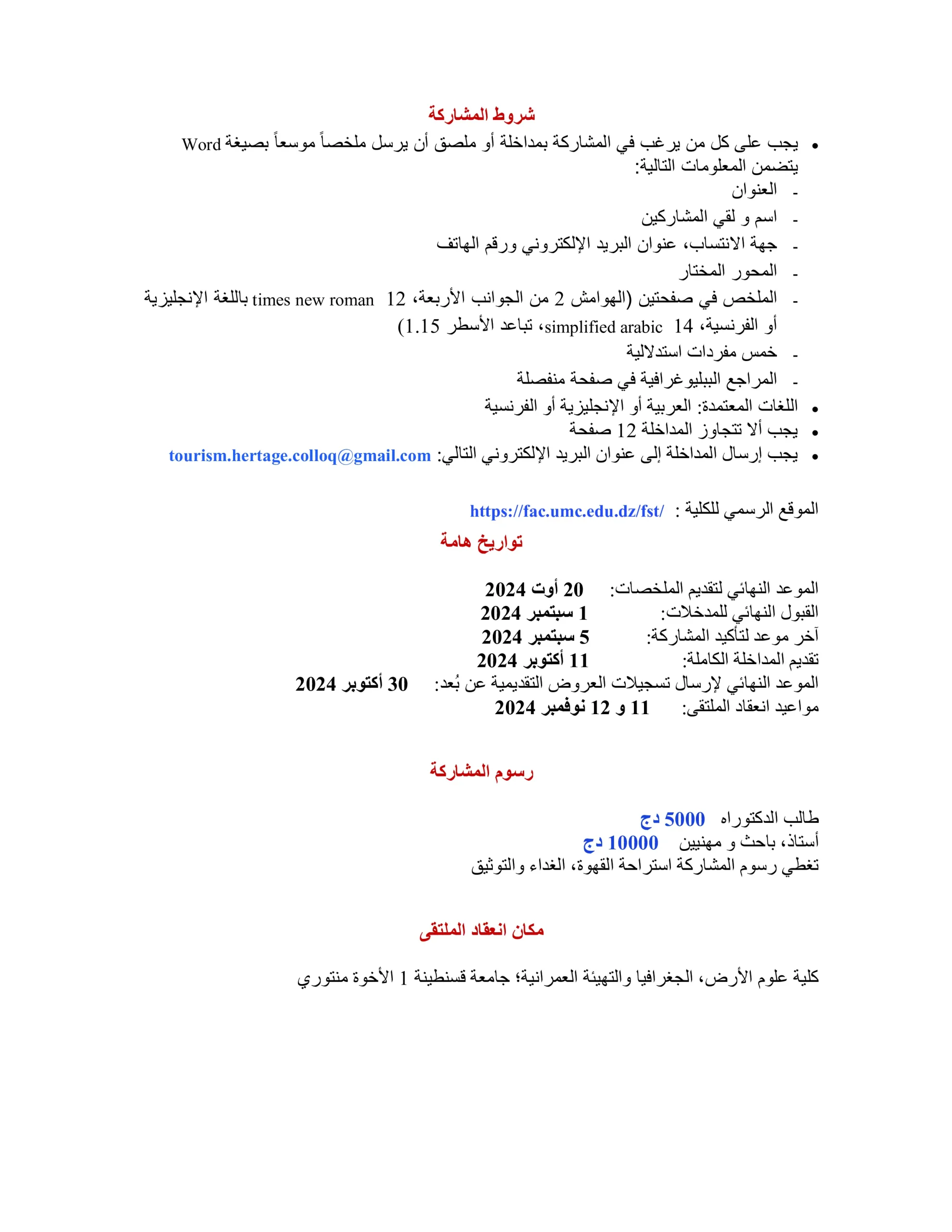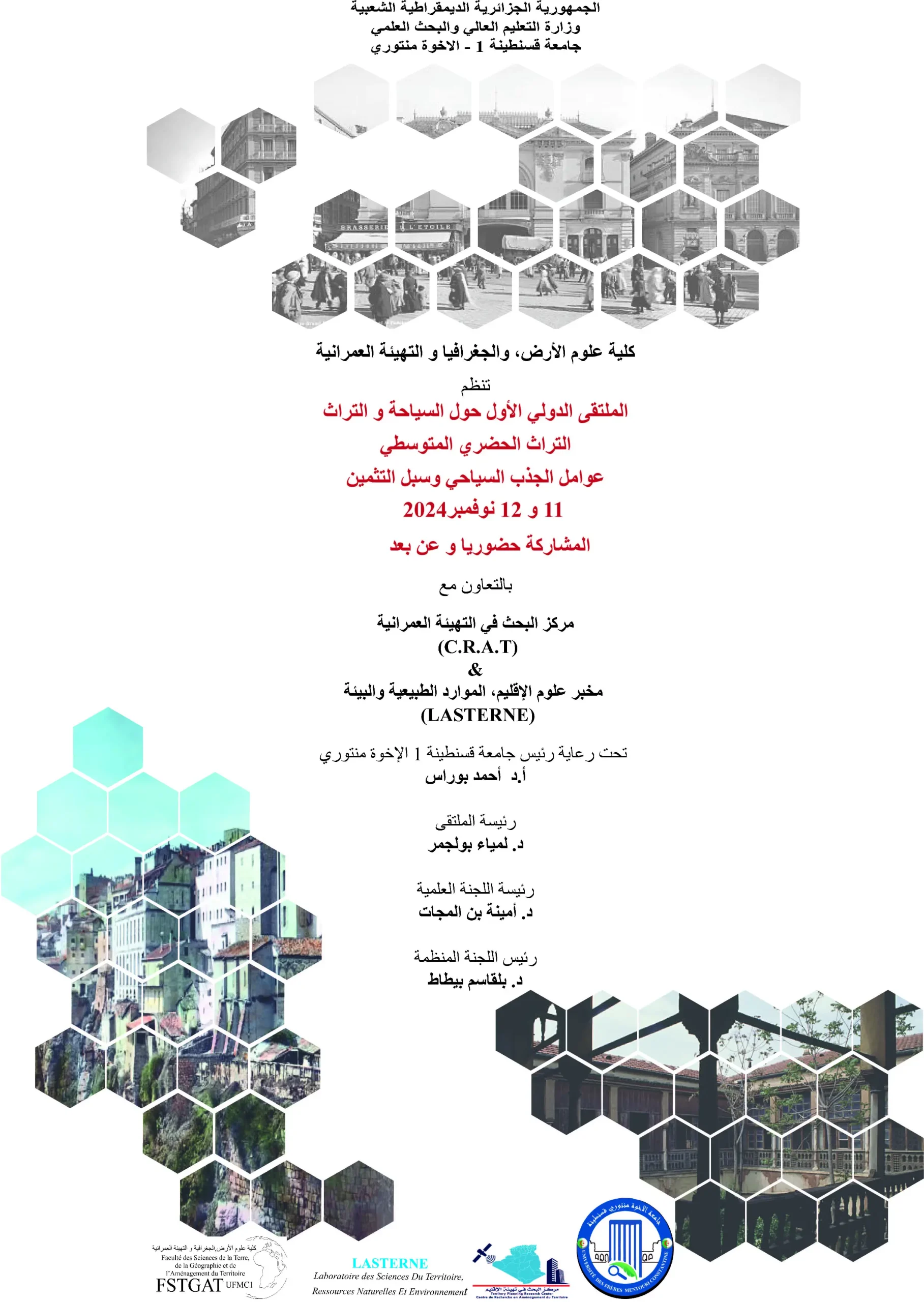 6 أكتوبر 2024بالتعاون مع مركز البحث في تهيئة الإقليم (CRAT) ومخبر علوم الإقليم والموارد الطبيعية والبيئة (LASTERNE)، وتحت رعاية رئيس جامعة الإخوة منتوري قسنطينة 1، تنظم كلية علوم الأرض والجغرافيا والتهيئة العمرانية ملتقى دولي بعنوان: “السياحة والتراث. التراث الحضري المتوسطي: عوامل الجذب السياحي سبل التثمين“.