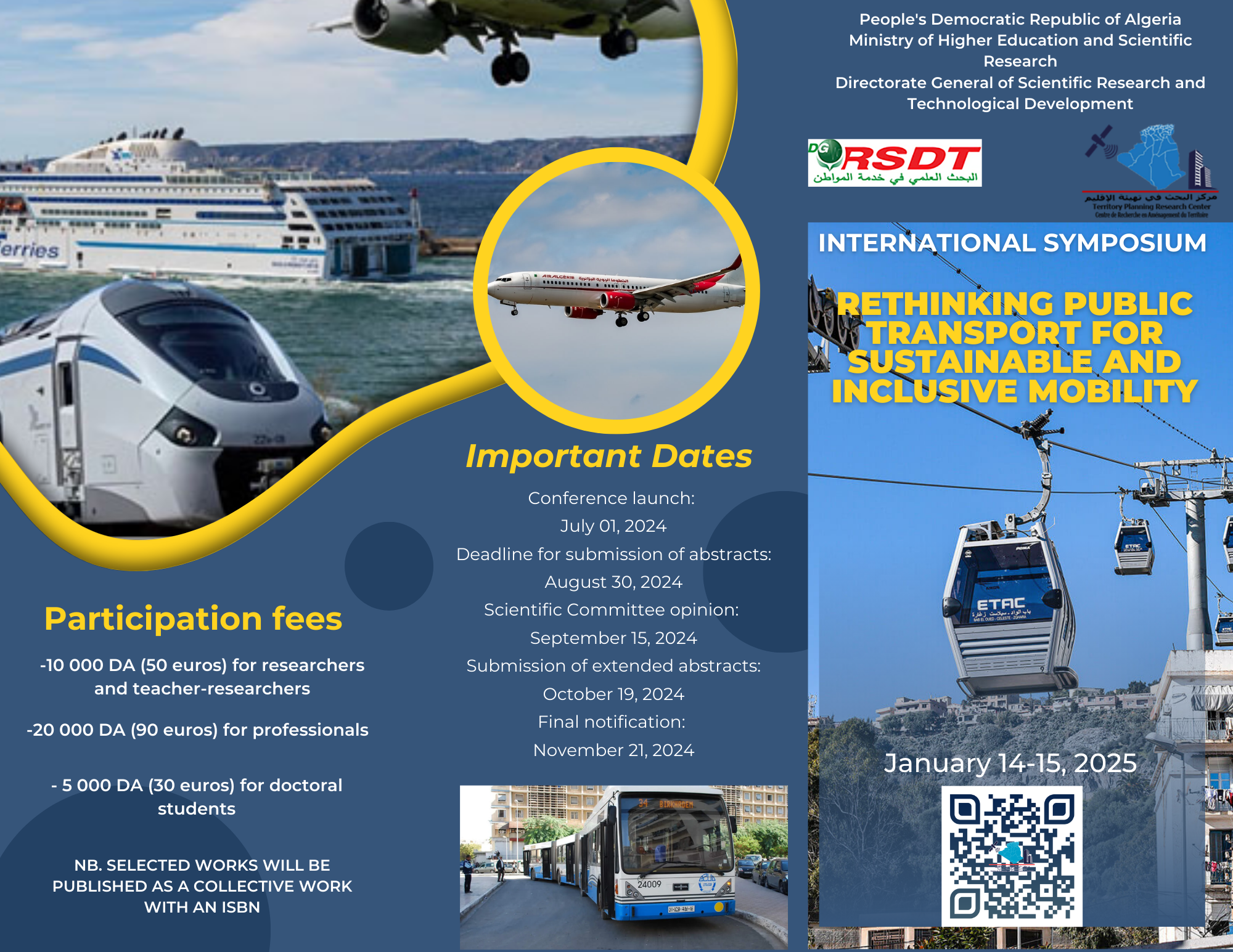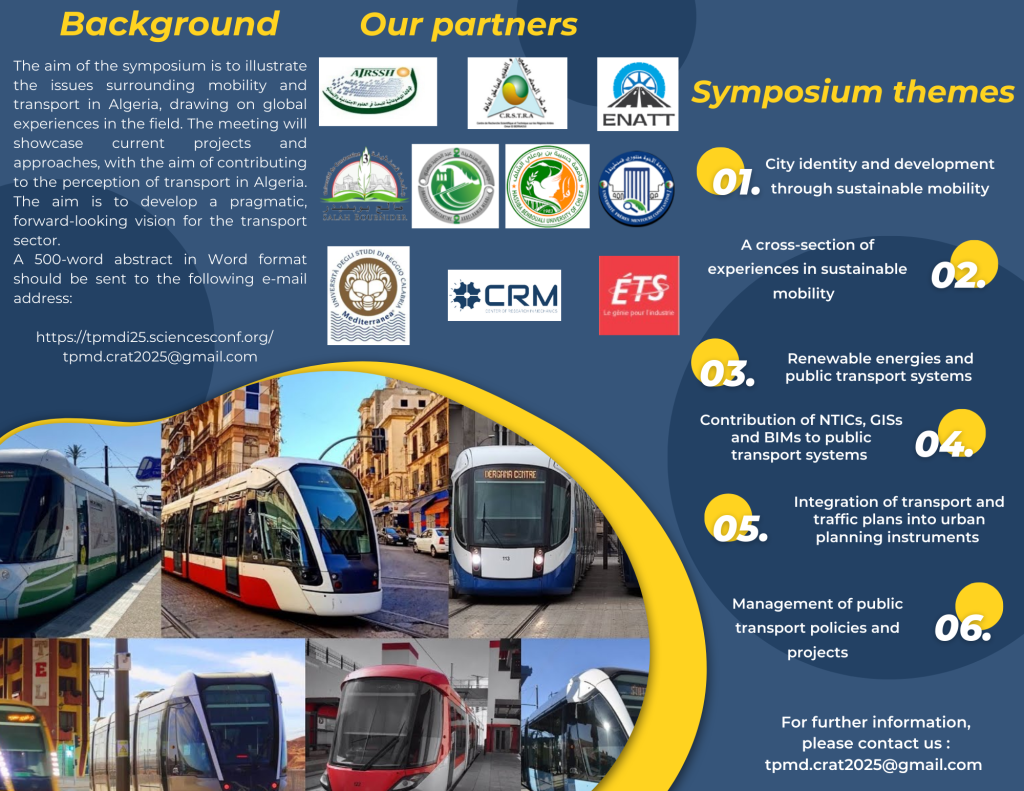 7 July 2024The Territory Planning Research Center (CRAT), in partnership with ATRSSH, CRM, CRSTRA, ENATT, UC3, UC1, UC2, the University of Mediterranean Studies of Reggio Calabria (Italy), and the École de Technologie Supérieure (ÉTS) of Montreal (Canada), is organizing an international conference titled: “Rethinking Public Transport for Sustainable and Inclusive Mobility” on January 14 and 15, 2025.
