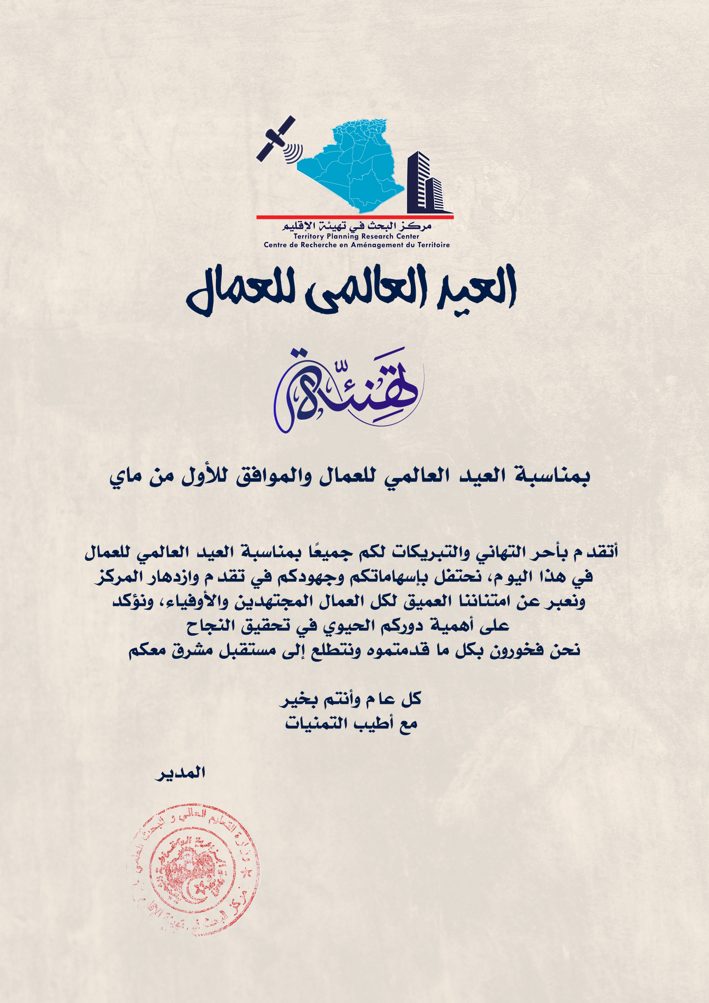 Liste provisoire des résultats de recrutement24 avril 2024Annonce des Résultats du Recrutement (Personnel de Soutien )6 mai 2024 2 mai 2024 Categories Évènements Fêtes et jours fériés Mots clés Fête du Travail 2024 Partager32 Articles Similaires4 février 2026Programme Science by WomenPour en savoir plus4 février 2026Projet international « nZEB-Mzab » : le CRAT retenu au programme i-COOP 2025Pour en savoir plus2 février 2026Risques climatiques : l’expertise du CRATPour en savoir plus