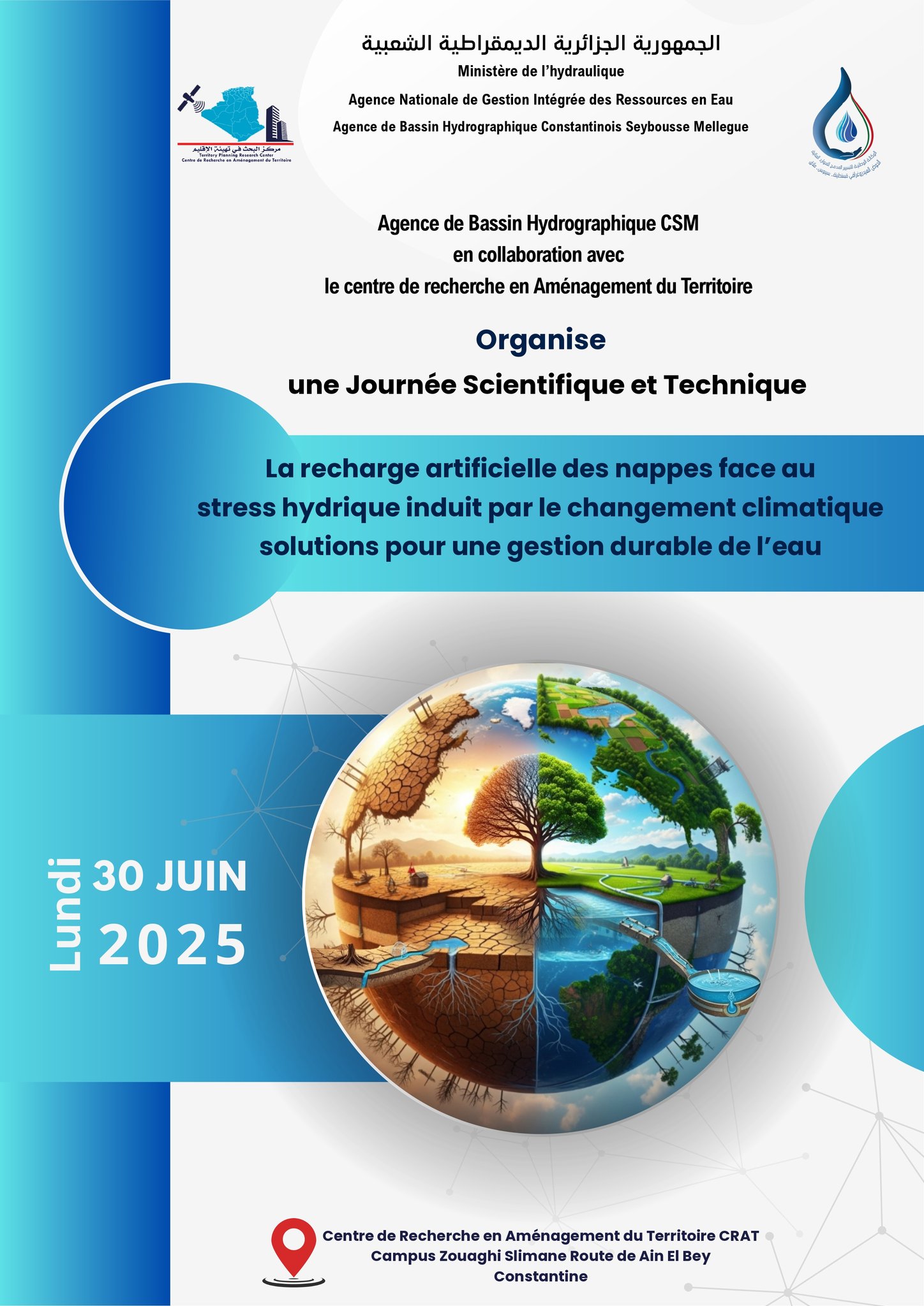 4 juillet 2025Sous la supervision de l’Agence Nationale de Gestion intégrée des Ressources en Eau (AGIR), et dans le cadre des programmes de recherche et de coopération scientifique et technologique, l’Agence du Bassin Hydrographique Constantinois Seybousse Mellegue (ABH-CSM), en collaboration avec le Centre de Recherche en Aménagement du Territoire (CRAT), organise une journée scientifique et technique le lundi 30 juin 2025 à partir de 9h, autour du thème :