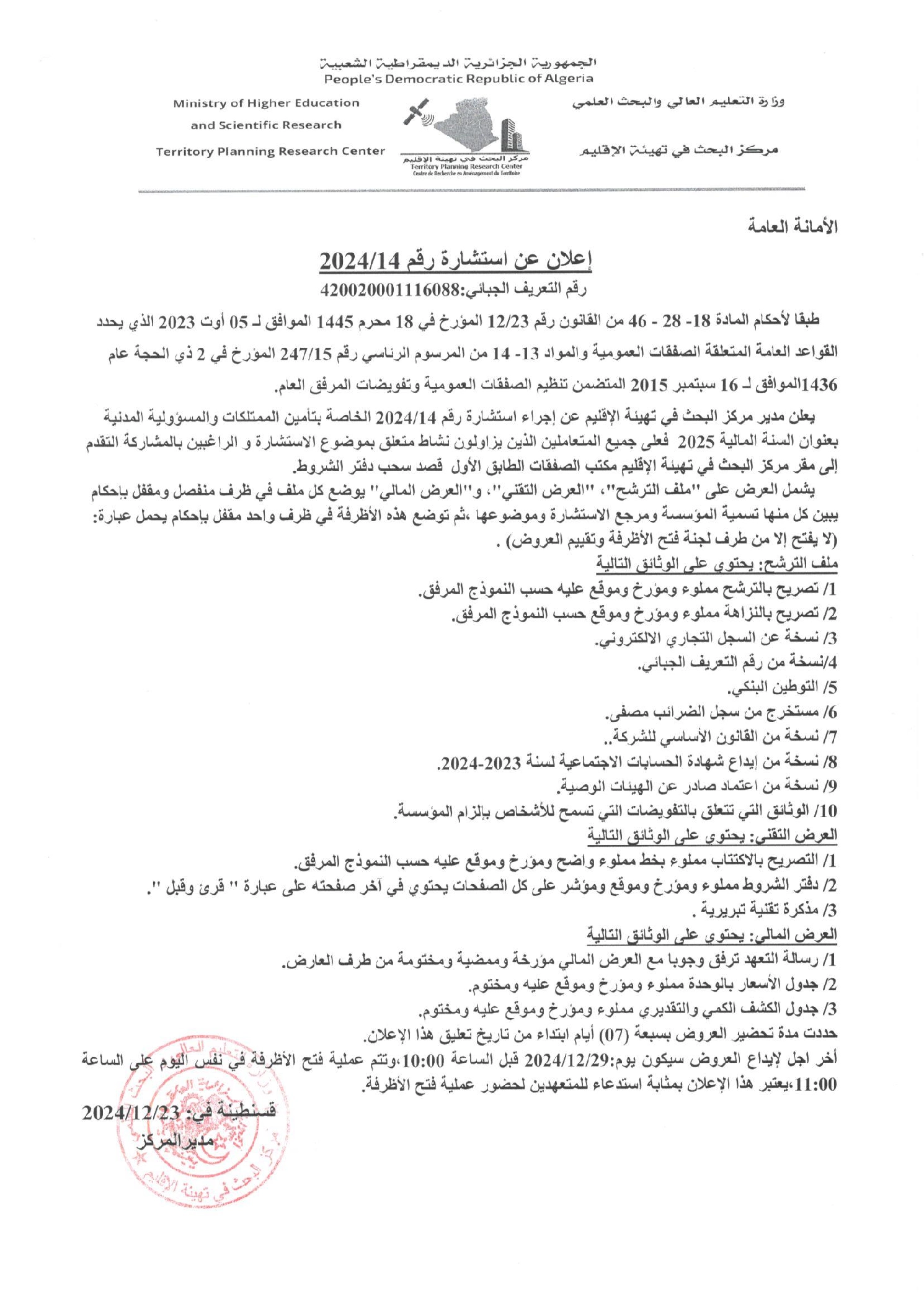 Journée de formation pour les étudiants de la Faculté des Technologies Modernes de l’Information et de la Communication20 décembre 2024Le Géoradar : Théorie, Application pour les Infrastructures et Formation à l’Utilisation26 décembre 2024 23 décembre 2024 Categories Announcements Marchés Mots clés Avis de consultation Partager35 Articles Similaires5 février 2026Avis d’infructuosité de la consultation n° 01/2026Pour en savoir plus4 février 2026Programme Science by WomenPour en savoir plus4 février 2026Projet international « nZEB-Mzab » : le CRAT retenu au programme i-COOP 2025Pour en savoir plus