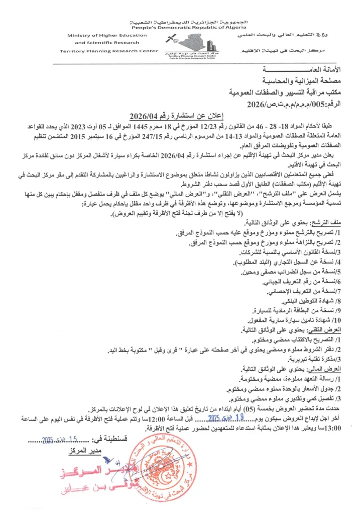 Tassili n’Ajjer : mission scientifique du CRAT sur biodiversité et patrimoine9 février 2026Avis de consultation suite à l’infructuosité N°01/202615 février 2026 15 février 2026 Categories Announcements Marchés Mots clés Avis de consultation suite à l’infructuosité Partager32 Articles Similaires15 février 2026Avis de consultation suite à l’infructuosité N°01/2026Pour en savoir plus5 février 2026Avis d’infructuosité de la consultation n° 01/2026Pour en savoir plus4 février 2026Programme Science by WomenPour en savoir plus
