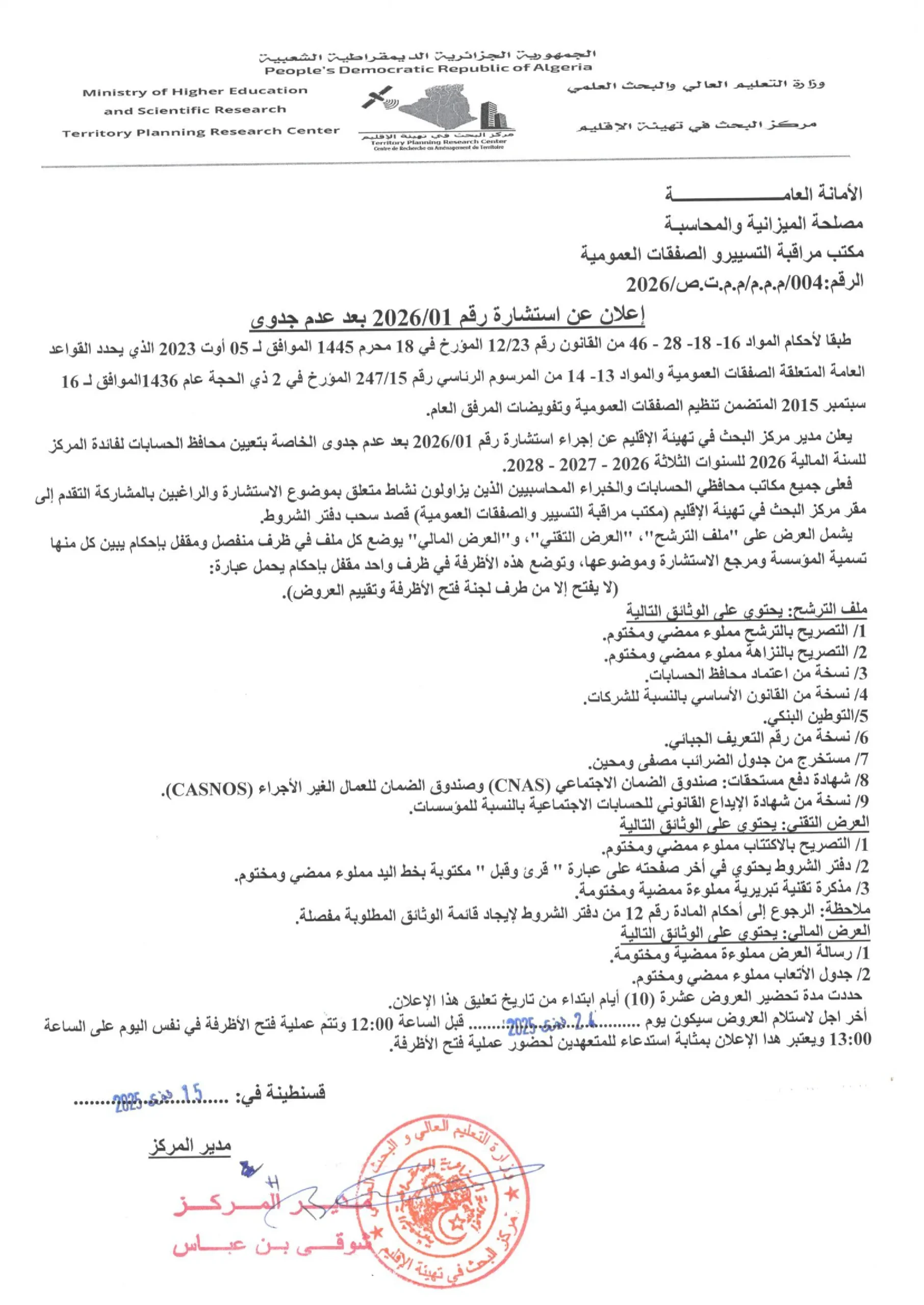 Avis de consultation N°04/202615 février 2026Séminaire international sur l’Eau, le Changement Climatique, l’Environnement et la Durabilité15 février 2026 15 février 2026 Categories Announcements Marchés Mots clés Avis de consultation suite à l’infructuosité Partager32 Articles Similaires15 février 2026Avis de consultation N°04/2026Pour en savoir plus5 février 2026Avis d’infructuosité de la consultation n° 01/2026Pour en savoir plus4 février 2026Programme Science by WomenPour en savoir plus