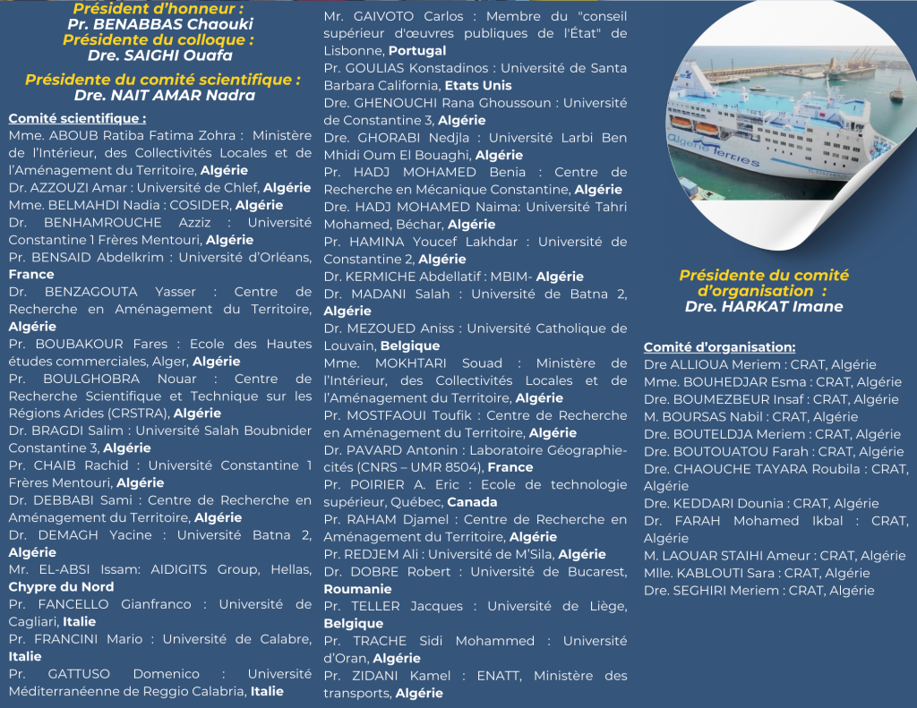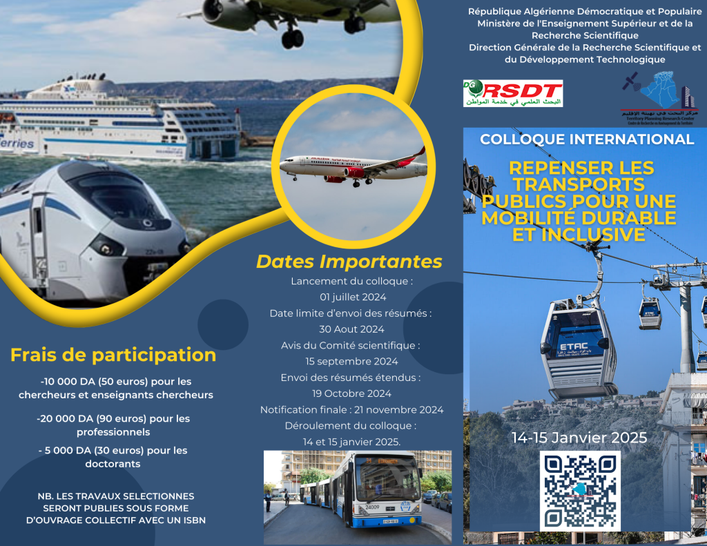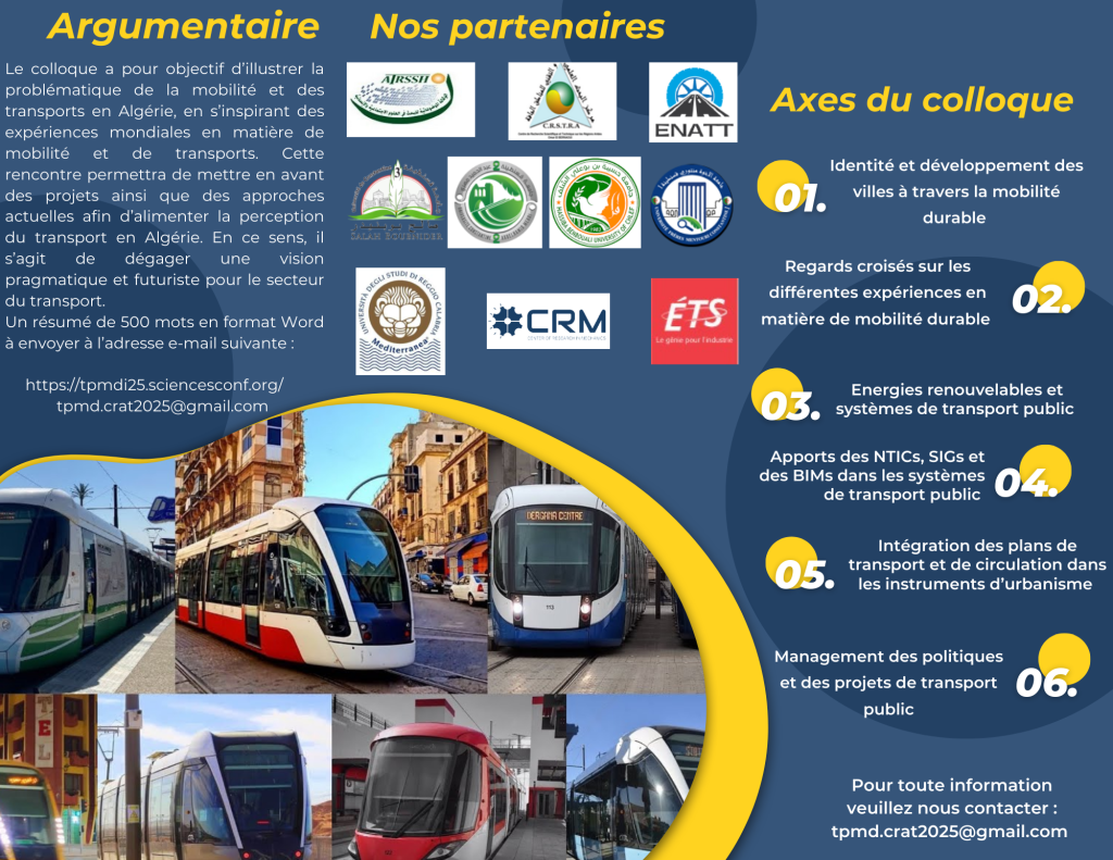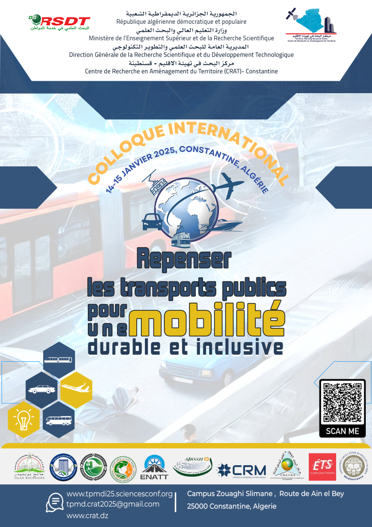 4 juillet 2024Le Centre de Recherche en Aménagement du Territoire (CRAT), en partenariat avec l’ATRSSH, le CRM, le CRSTRA, l’ENATT, l’UC3, l’UC1, l’UC2, l’Université des Études Méditerranéennes de Reggio Calabria (Italie) et l’École de Technologie Supérieure (ÉTS) de Montréal (Canada), organise un colloque international intitulé : « Repenser les transports publics pour une mobilité durable et inclusive » .