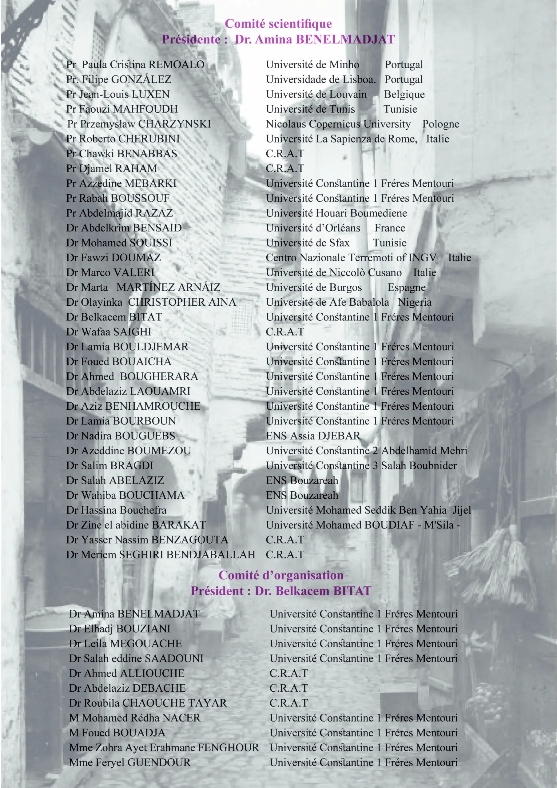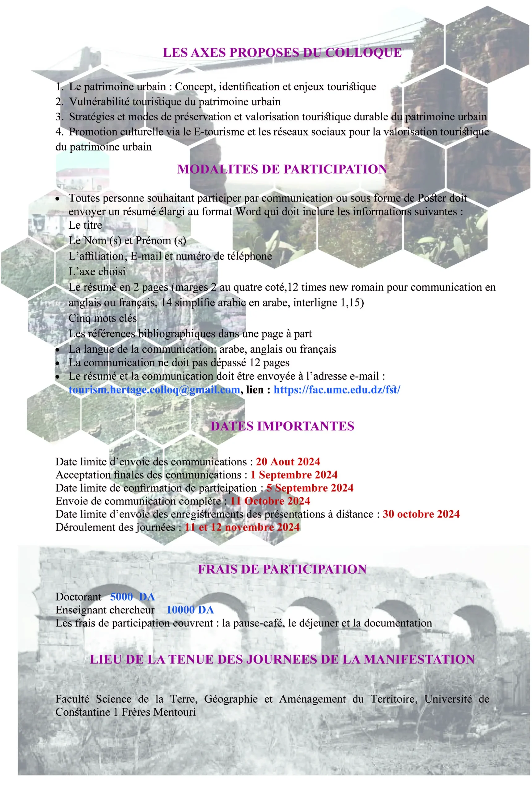 6 octobre 2024En collaboration avec le Centre de Recherche en Aménagement du Territoire (CRAT) et le Laboratoire des Sciences du Territoire et Ressources Naturelles et Environnement (LASTERNE), sous la bienveillance du recteur de l’Université Frères Mentouri Constantine 1, la Faculté des Sciences de la Terre, Géographie et Aménagement du Territoire organise un colloque international intitulé : « Tourisme et Patrimoine. Le patrimoine urbain méditerranéen : Attraits Touristiques et Valorisation ».